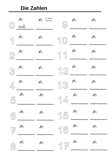 Deutsch: AB zum Ausmalen der wichtigsten Zahlen und Notieren in Deutsch sowie in der Muttersprache.